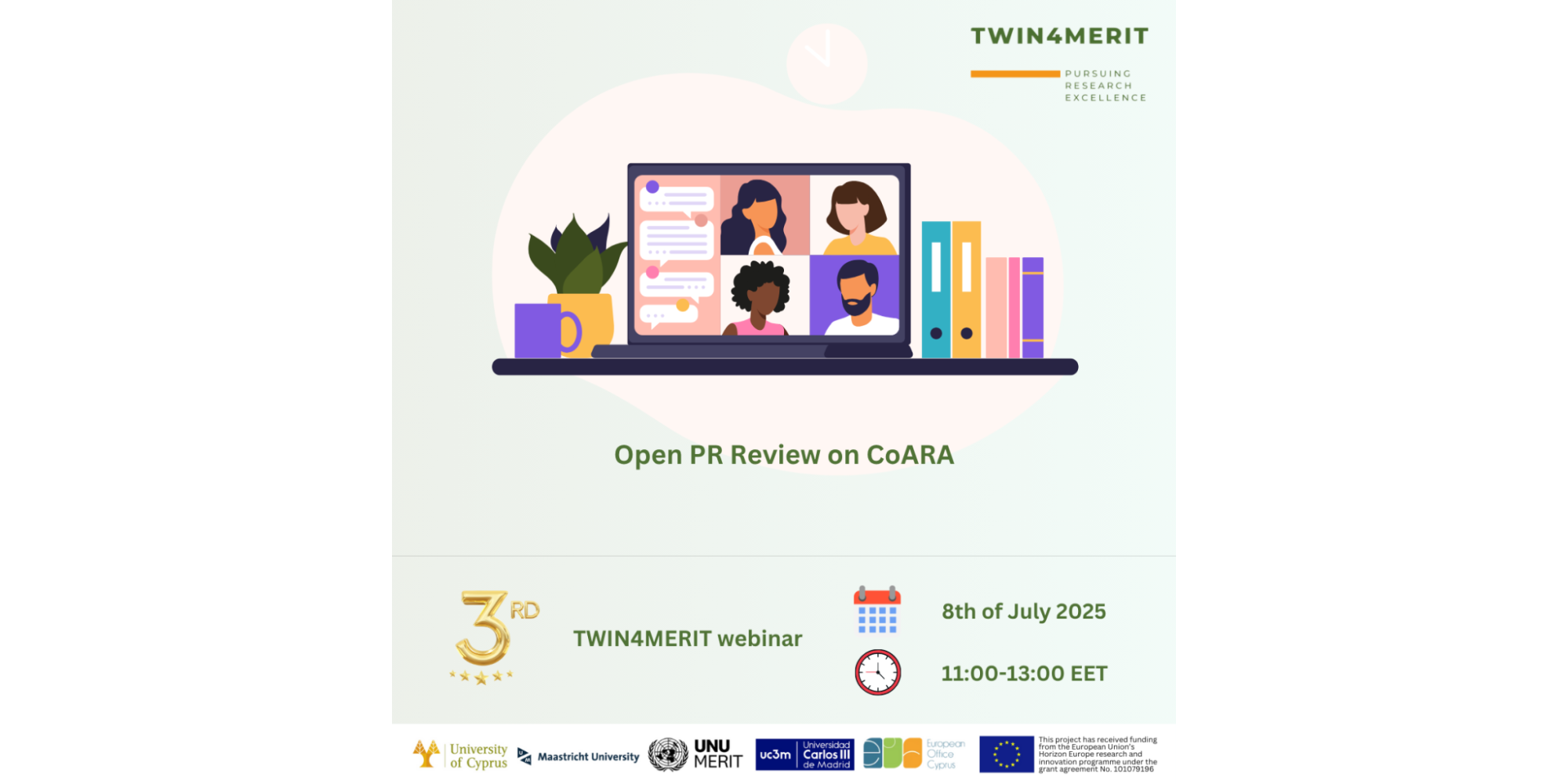 The European project Twinning for Excellence in Management and Economics of Research and Innovation (TWIN4MERIT), coordinated by the University of Cyprus, is pleased to announce its third open training webinar, titled “Open Peer Review on CoARA”, which will take place on Tuesday, 8 July 2025, from 11:00 to 13:00 EET. The webinar will be held via Microsoft Teams and can be joined through the following link: